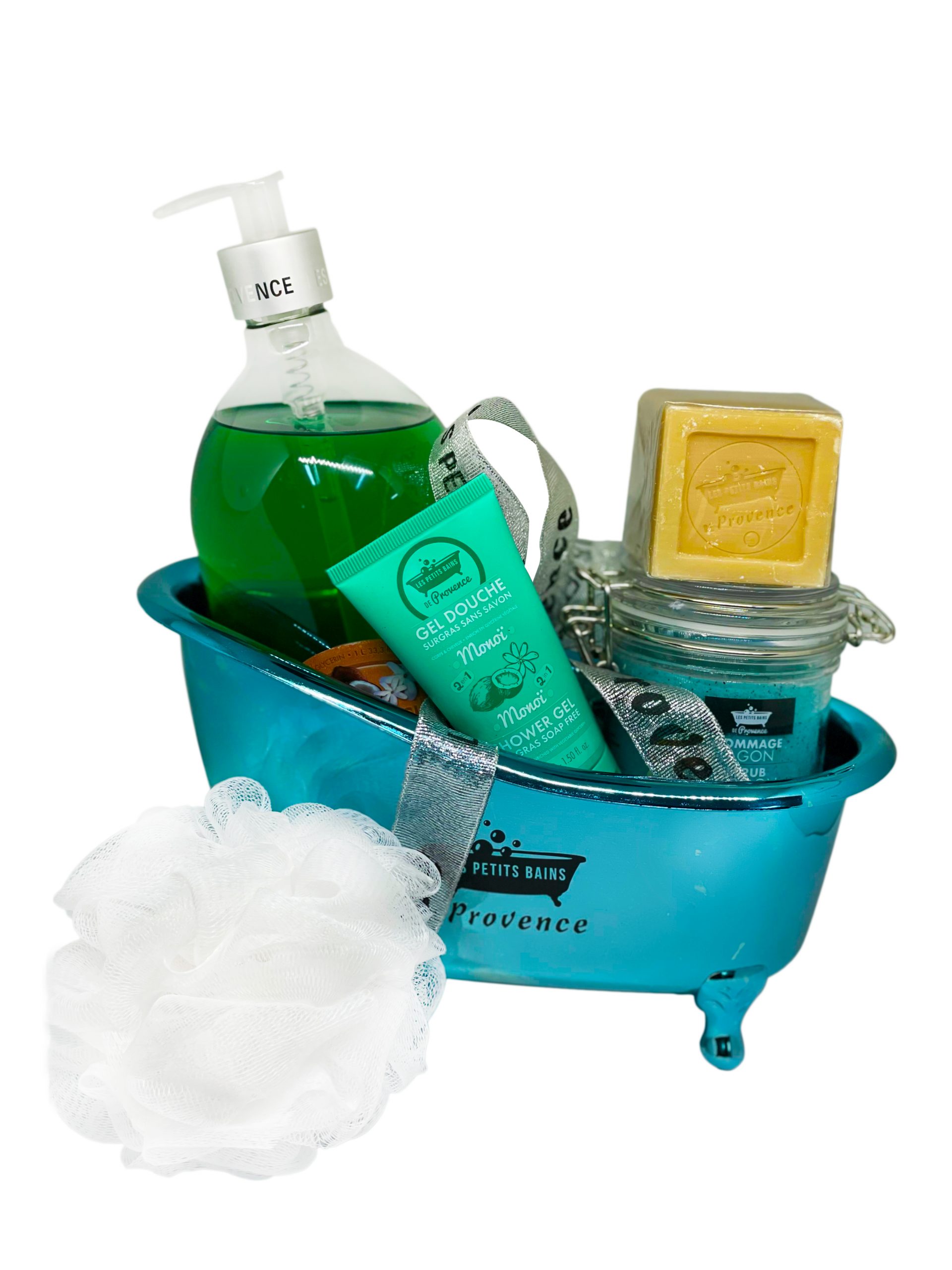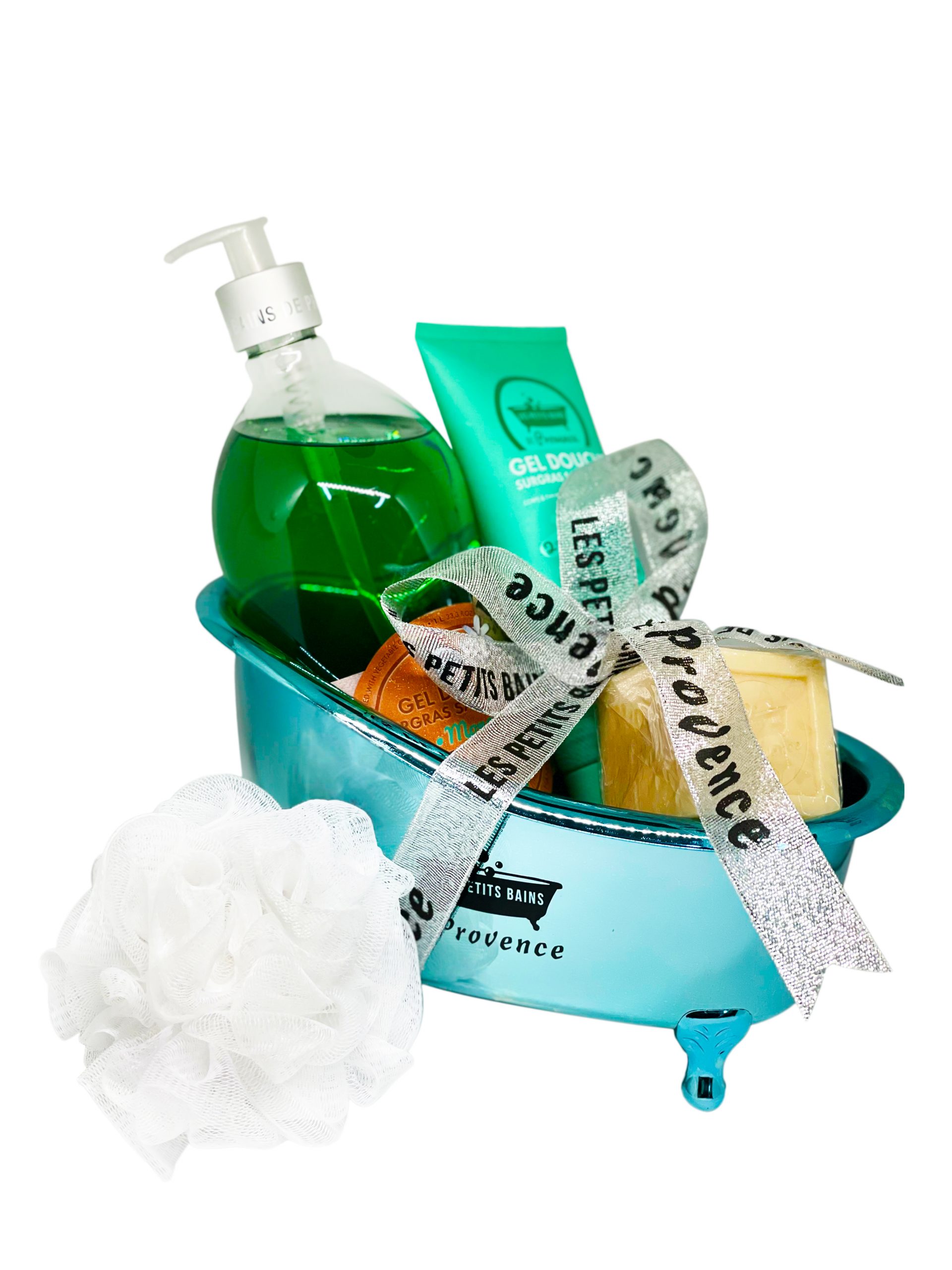 Coffret baignoire contient une bouteille de gel douche surgras au Agrumes , gel douche tube Pêche et un savon d’Amande.
