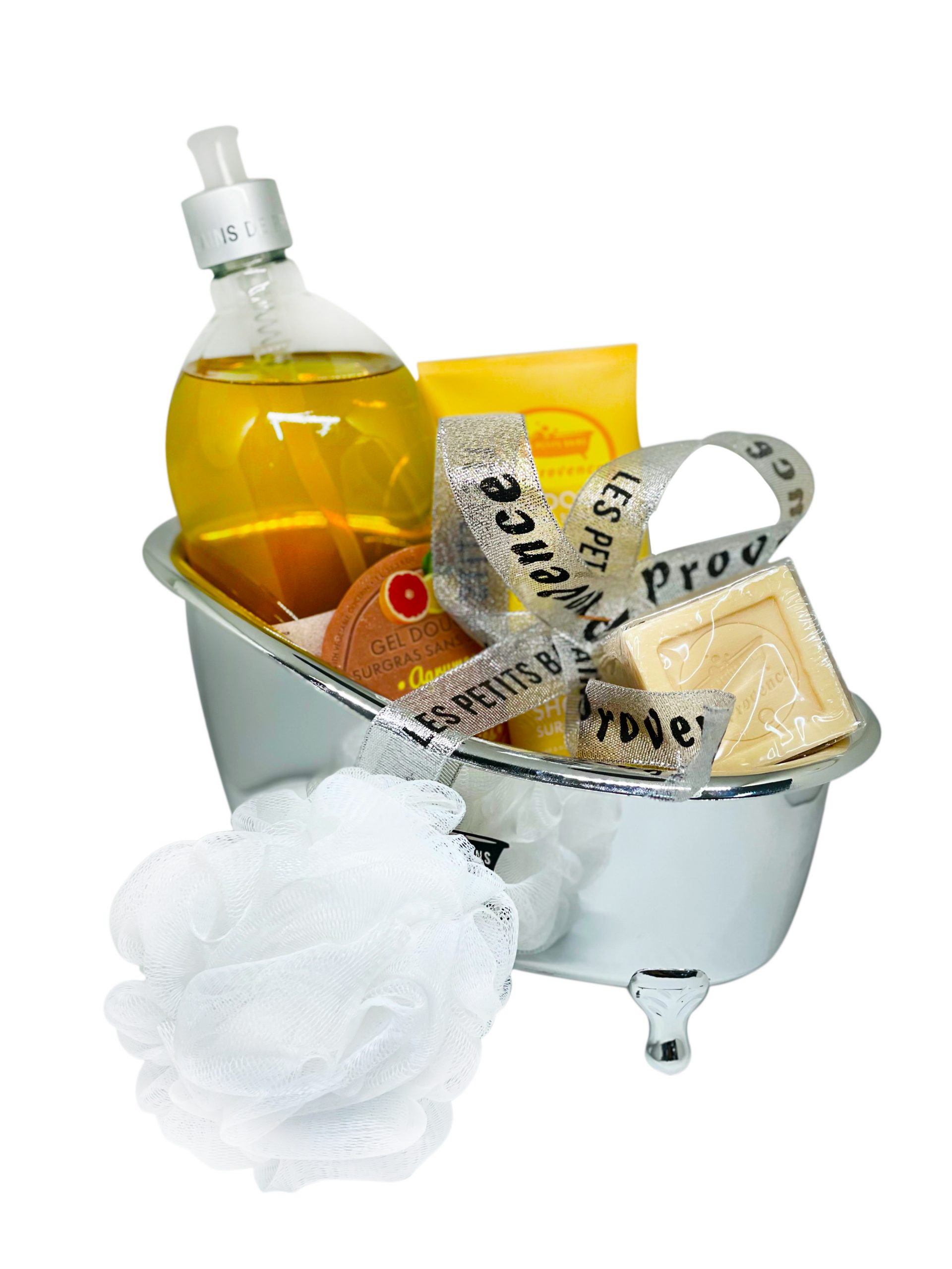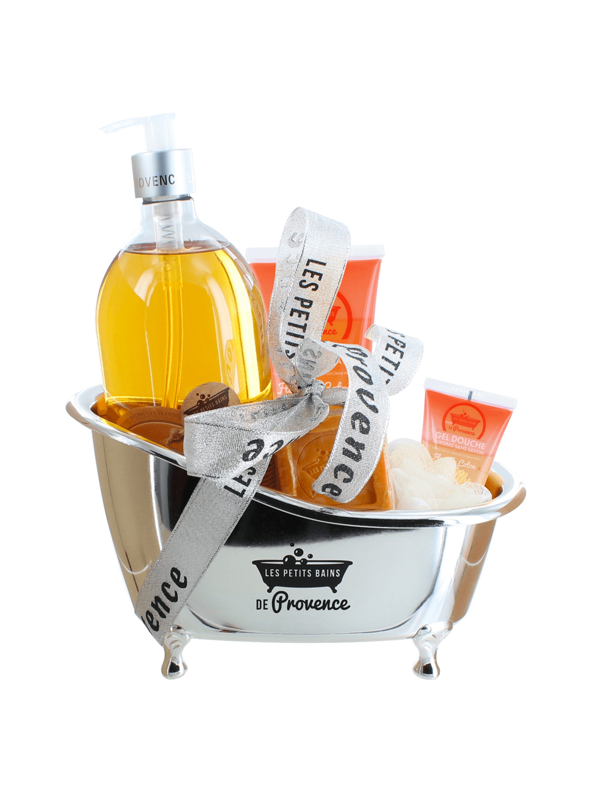 Coffret baignoire contient une bouteille de gel douche surgras au Litchi , gel douche tube Amande et un savon Lavande.